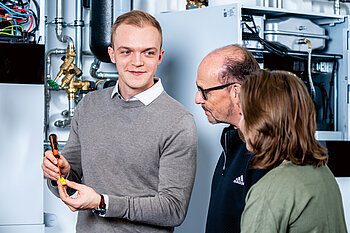 Das Viessmann Schulungsangebot ist eng an den typischen Prozessen des SHK-Handwerks angelehnt: Bei praxisorientierten Präsenzseminaren trainieren kleine Gruppen direkt („hands on”) an den Energiesystemen den sicheren Umgang bei der Installation und Wartung von Produkten, Tools und Zubehör. Wesentliche Programmpunkte befassen sich auch mit der Konnektivierung von Wärmepumpen, Heizkesseln, Lüftungsgeräten und Batteriespeichern. Informationen über die sich laufend ändernde Gesetzeslage zum Thema Energieeinsparung und Klimaschutz gehören auch dazu.