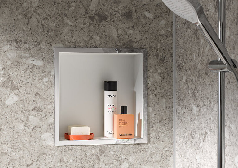 Die Wandeinbaubox sorgt nicht nur für Ordnung im Duschbereich, sie stellt zudem ein optisches Highlight dar. Der Kunde hat hier die Auswahl zwischen einem Rahmen in Chromoptik und in Schwarz-matt. Das Modell in Chromoptik wird in Kombination mit einer zeitlos modernen Rückwand in den Farbvarianten RenoDeco Seidenmatt Uni, Arctic-Weiß oder in Seidenmatt Uni, Aschgrau angeboten. Der Rahmen in Schwarz-matt ist mit einer Rückwand in RenoDeco Seidenmatt Uni, Samt-Schwarz erhältlich. Wer noch mehr Abstellmöglichkeiten benötigt, kann auch mehr als eine Box in den Duschbereich integrieren. Die Kombination aus mehreren Wandeinbauboxen ist nicht nur praktisch, sondern lockert die Duschkabine auch optisch auf.