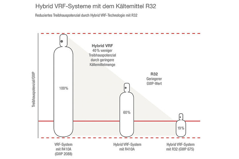 Der Einsatz eines Hybrid VRF-Systems mit dem Kältemittel R32 reduziert das Treibhauspotenzial, so dass sich schon heute das von der EU geforderte CO2-Äquivalent erreichen lässt. Abbildung: Mitsubishi Electric
