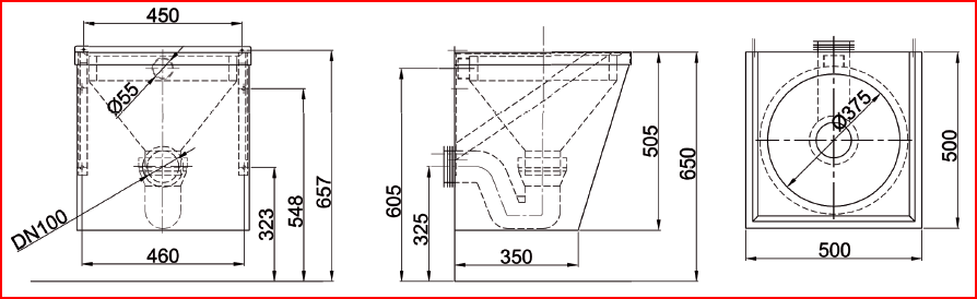 Den LOGGERE-BLINOX Fäkalausguss gibt es sowohl wie oben abgebildet mit einer Verleidung zur wandhängenden Montage als auch offen ohne Verkleidung.