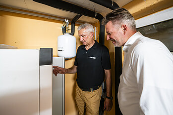 Das Grundstück bot ausreichend Platz, um Erdwärme als Wärmequelle zu nutzen. Vor jedem Gebäude wurden fünf Bohrungen in je 150 Metern Tiefe eingebracht und mit Erdsonden bestückt. Die Gasheizungen in den Kellern der beiden Häuser wurden durch Sole-Wasser-Wärmepumpen, Modell NIBE F1355, mit einer Heizleistung von 43 kW ersetzt. Die Wärmepumpen sind drehzahlgeregelt, sodass sich die Leistung der Wärmepumpe automatisch an die reduzierte Heizlast anpasst, sobald die zu einem späteren Zeitpunkt geplanten energetischen Sanierungsmaßnahmen ausgeführt werden. Ein Austausch der Heizkörper in den Wohnungen war für eine effektive Arbeit der Wärmepumpe nicht notwendig.