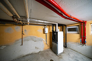 Aufgrund des besseren energetischen Standards reicht in diesem Gebäude eine Heizleistung von 25 kW für die Heizung- und Warmwasserbereitung der 12 Wohnungen aus. Daher wurde hier eine Sole-Wasser-Wärmepumpe vom Typ NIBE F1155-25, ebenfalls in Verbindung mit einem Warmwasserspeicher eingesetzt.