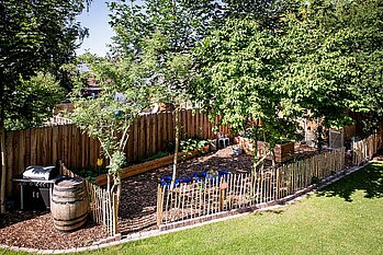 Zu dem knapp 1.100 Quadratmeter großen Grundstück gehört auch ein Garten, den die Familie mit einem kleinen Teich, hübschen Blumenbeeten, einem Spielplatz für die Kinder, einer Grillecke und einer weitläufigen überdachten Terrasse zu einer wahren Wohlfühloase entwickelt hat. Der Hausherr hat viele Renovierungsarbeiten und Schönheitsreparaturen an dem Haus vorgenommen und auch ein Nebengebäude, das früher einmal als Pferdestall diente umgebaut, sodass es nun als Schuppen für Gartengeräte verwendet werden kann.