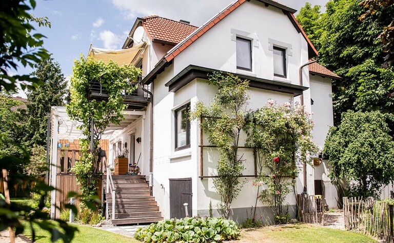 Das Grundstück liegt von der Straße aus etwas versteckt in zweiter Reihe. Zwei große Kastanienbäume zieren die Einfahrt und spenden im Sommer Schatten für das Haus. Beim Einzug hat die Familie das Haus teilsaniert. Die Fenster wurden ausgetauscht und die Decke zum Dachgeschoss gedämmt. Eine kleine Photovoltaik-Anlage mit 3,5 kW wurde auf dem Dach montiert, diese soll in Zukunft noch erweitert werden.