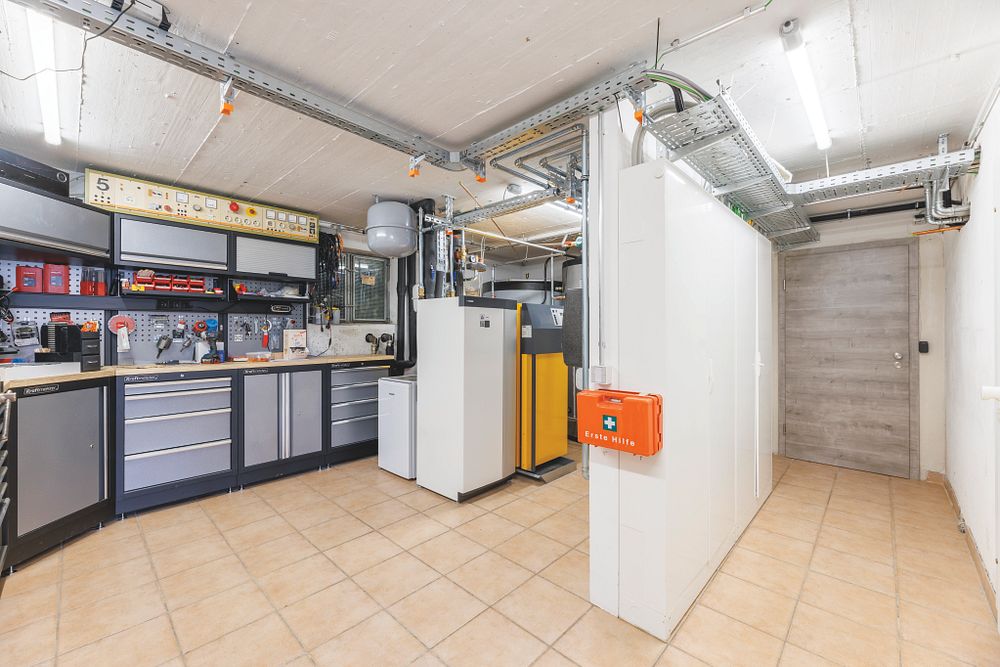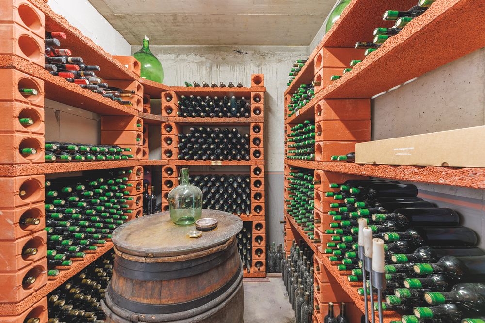 Der Hausherr ist begeisterter Hobby-Winzer, zusammen mit einem Freund besorgt er sich Monticello-Trauben aus Italien, die sie gemeinsam keltern und in Flaschen abfüllen. Der Raum, in dem früher die Öltanks standen, kann nun als Weinkeller genutzt werden und bietet den idealen Platz für die Lagerung der verschiedenen Jahrgänge des selbst hergestellten Weins.