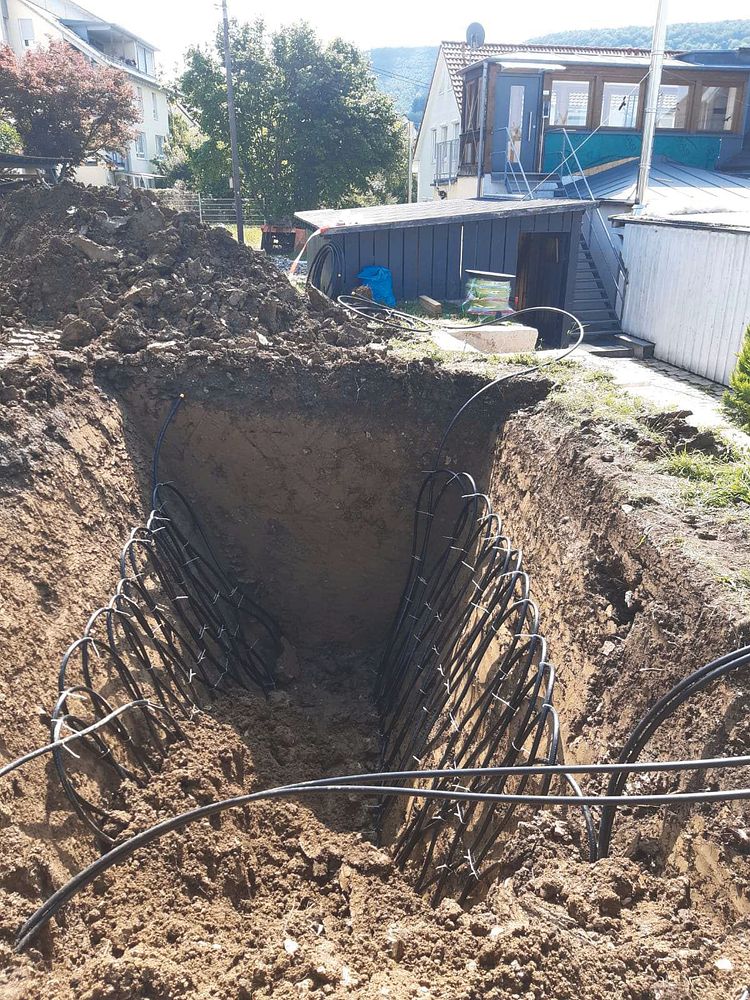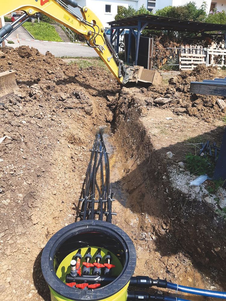 Beim Austausch der Ölheizung gegen eine Sole/Wasser-Wärmepumpe entscheiden sich die Hausbesitzer für einen V-Ringgraben als Wärmequelle und binden einen bestehenden Stückholzkessel in das System ein.