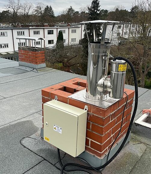 In der Papageiensiedlung kam das Modell Outdoor Top für die Montage an der Schornsteinmündung zum Einsatz. Diese Wahl hat mehrere Vorteile: In den Wohnungen entsteht kein Schmutz, denn der Einbau findet komplett auf dem Dach statt. Durch den integrierten Temperaturfühler startet das Gerät selbstständig bei Erreichen der Einschalttemperatur. Es eignet sich für alle Abgasanlagen, egal ob Schornsteine aus Mauerwerk oder mit metallischen oder keramischen Innenrohren versehene, wobei der Kaminzug praktisch unverändert bleibt. Für den Betrieb ist lediglich ein Stromanschluss mit 230 Volt erforderlich.
