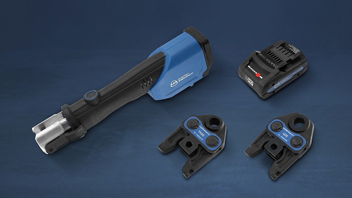 Die KAN-therm Presswerkzeuge AC 3000 (kabelgebunden) und DC 4000 (mit Schnelladegerat und zwei Akkus) sind arbeitserleichternd mit einer automatischen Backenrückführung ausgestattet.