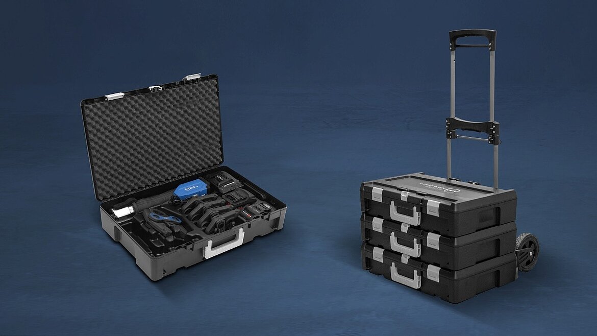 Komplette Werzeugsets mit aneinander steckbaren Koffern und optionalem Trolley, sorgen für sichere Verfügbarkeit und einfaches, sowie ermüdungsarmes Arbeiten.
