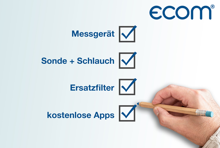 Damit Sie direkt mehrere Messungen ohne Unterbrechung durchführen können, liefert ecom praktische Verbrauchsmaterialien gleich mit. Druckerpapier und Filter für die ersten Wochen und Monate sind ebenso im Paket enthalten, das den Einsatz vor Ort komfortabler macht.