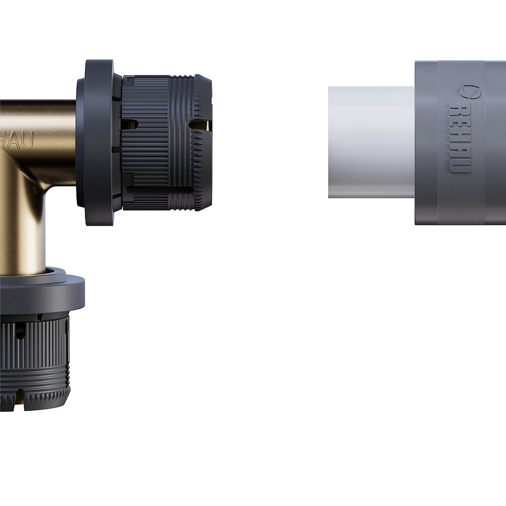Die Verbindung geht denkbar einfach: Zunächst wird das Rohr mit einer Rohrschere von REHAU abgelängt und die Schiebehülse auf das Rohr geschoben. Ein Aufweiten oder ein Kalibrieren des Rohres ist nicht erforderlich. Danach wird der Fitting bis zum Anschlag in das Rohr gesteckt. Mit einem Sichtfenster kann der Installateur die korrekte Lage des Rohres am Fittingkragen überprüfen. Abschließend verpresst er die Schiebehülse mit dem Montagewerkzeug auf den Fitting – fertig! Einfach und schnell – ganz ohne Aufweiten. Und sicher – ganz ohne O-Ring.