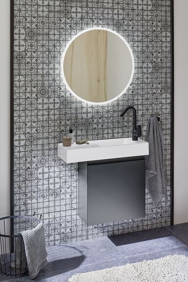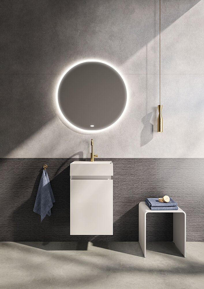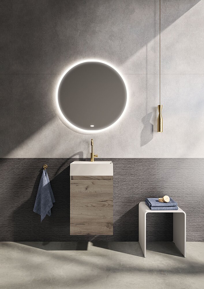 Design Waschplatz fürs Gästebad und WC - runder Spiegel mit Beleuchtung, Unterschrank in Holzoptik und Keramikwaschtisch Fotos: repaBAD