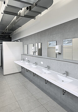 Neben den Urinal-Anlagen kamen in den Wasch- und Duschbereichen Armaturentechnik und maßgeschneiderte Waschtische von KWC Professional für eine komfortable und zugleich funktionale Sanitärraumausstattung zum Einsatz. F5LM Einhebelmischer wurden mit den pflegeleichten und gleichzeitig robusten Waschtischen aus MIRANIT kombiniert. Die Duschen sind mit den vorgefertigten und damit einfach zu installierenden F5ST Edelstahl-Duschpaneelen mit komfortabler Thermostatfunktion ausgestattet.