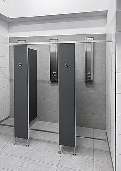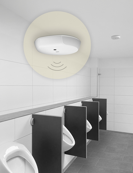 Das innovative F5 Urinal-Spülsystem sichert die Sauberkeit in den Sanitäranlagen. Mit Hilfe einer zentralen Raumüberwachung sorgt der an der Decke montierte Sensor für die automatische Spülung der Urinale nach jeder Benutzung. Das moderne Spülsystem reduziert erheblich Montagezeiten und Anschaffungskosten. Anstelle von vielen Urinal-Einzelauslösern war nur ein zentraler Deckensensor benötigt in Kombination mit jeweils einer Smart Urinal Unit pro Urinal.