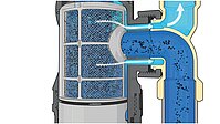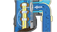 Die Reinigungswirkung der Armatur basiert auf drei Stufen: doppelte Filterwirkung dank zwei radial angeordneter Trenngewebe, ein zentraler Magnet und ein Schmutzfänger im Auslass.