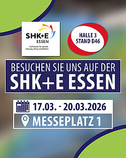 Besuchen Sie uns im März auf der SHK+E Essen in Halle 3 Stand D46 und erfahren Sie alles über unsere neuesten Produktinnovationen. Für Tickets treten Sie bitte mit uns in Kontakt. Wir freuen uns auf Sie!