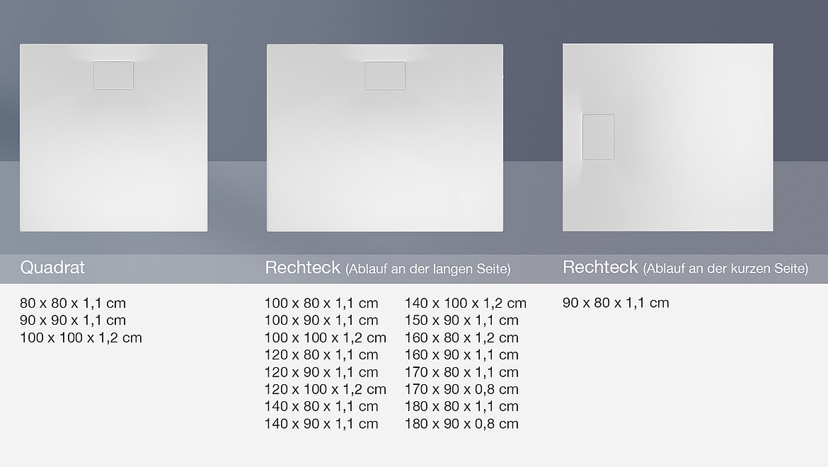 Mit 11 mm innerer Tiefe gehört sie zu den sehr flachen Wannen und überzeugt auch durch die niedrige Gesamthöhe von 34 - 45 mm. Die Größen sind vom kleinstmöglichen Maß 80 × 80 cm in der quadratischen Ausführung bis hin zur größten Ausführung mit 180 × 90 cm verfügbar. Der Punktablauf hat bei allen Wannen einen Durchmesser von 90 mm. Verdeckt wird dieser mit einer unauffälligen, eckigen Abdeckung in Duschwannenfarbe.