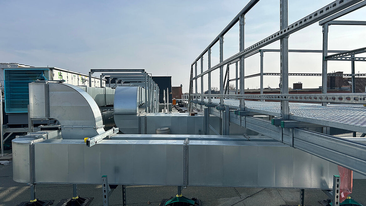 Auf dem Flachdach des Naturkundemuseums wurden massive Anlagen aufgeständert – darunter drei RLT-Geräte mit bis zu sieben Tonnen und drei Rückkühler mit jeweils drei Tonnen Gewicht. Zusätzlich planten die Verantwortlichen die Unterkonstruktionen für Lüftungskanäle und Verrohrungen und montierten bequeme Zugänge für Wartungsarbeiten. Dabei achteten sie darauf, Treppen und Übergänge an den Kreuzungspunkten der Revisionswege zu berücksichtigen, sodass ein sicherer und komfortabler Zugang gewährleistet ist.