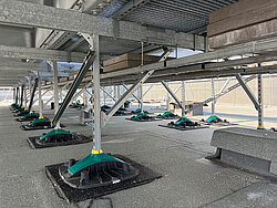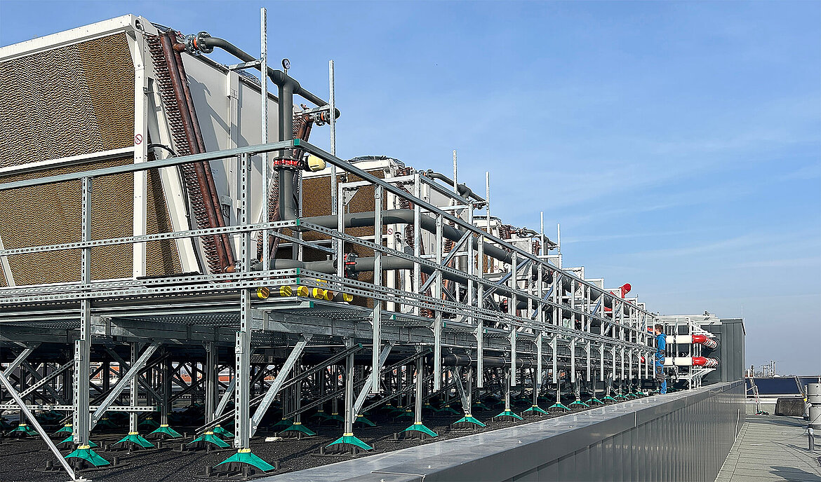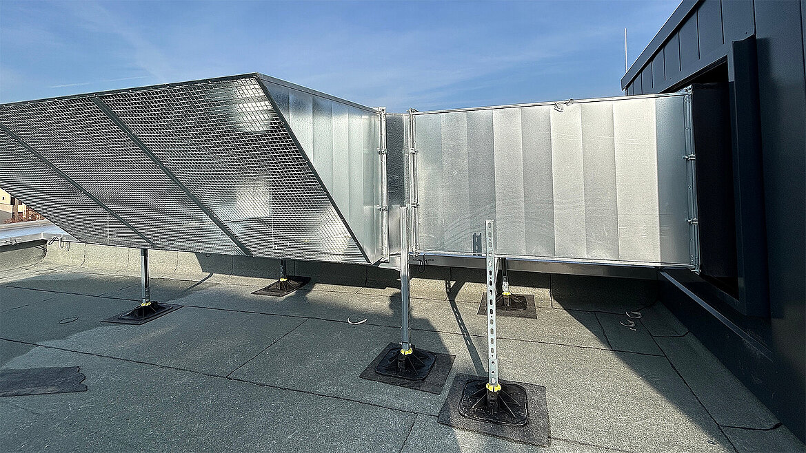 Außerdem forderte der Dachdecker mehr Platz unter den Geräten wegen der Dachinspektion in den Folgejahren gemäß DIN 18531-1. Auch die Dauerdruckfestigkeit der Dachdämmung unter Berücksichtigung von Geräte-, Konstruktions- und Ballastierungsgewicht, Schneelast gemäß DIN EN 1991-1-3 und Windlast gemäß DIN EN 1991-1-4 musste sichergestellt werden.
