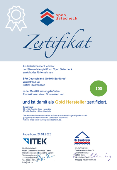 Open Datacheck (ODC) gilt als eine der wichtigsten Plattformen für den Datentransfer von Herstellern an den Großhandel und das Handwerk. Dort werden die Produktinformationen nach der Datenqualitätsrichtlinie (DQR) des Deutschen Großhandelsverbandes (DG) Haustechnik bewertet und in einer Scorecard dokumentiert. SFA zählt mit Sanibroy und Kinedo zu den Herstellern, die regelmäßig Höchstwerte erzielen und den ODC-Goldstatus halten. Dieser bescheinigt eine Datenqualität, die den Anforderungen der Branche in Bezug auf Vollständigkeit, Struktur und Aktualität entspricht.