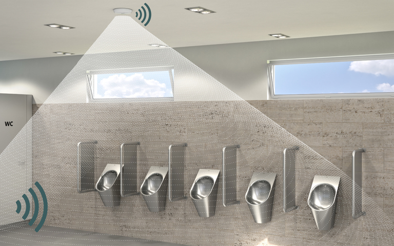 Im dezenten Kunststoffgehäuse (in Weiß oder Schwarz erhältlich) befindet sich ein Steuerungsmodul, das mehrere Nutzer gleichzeitig im Raum erfassen kann. Der Sensor kommuniziert drahtlos mit der hinter dem Urinal integrierten Smart Urinal Unit und löst auf diese Weise die Spülung aus.