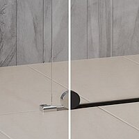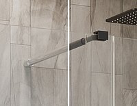 Mit einem robusten Rollenlauf, reversibler Montage und einer verstellbaren Strebe bis 1 m bietet die Walk-In Schiebetür maximale Flexibilität. Die überlappenden Glaselemente ermöglichen eine Gesamtbreite bis zu 1210 mm. Demnach ist Sie perfekt für individuelle Einbausituationen.