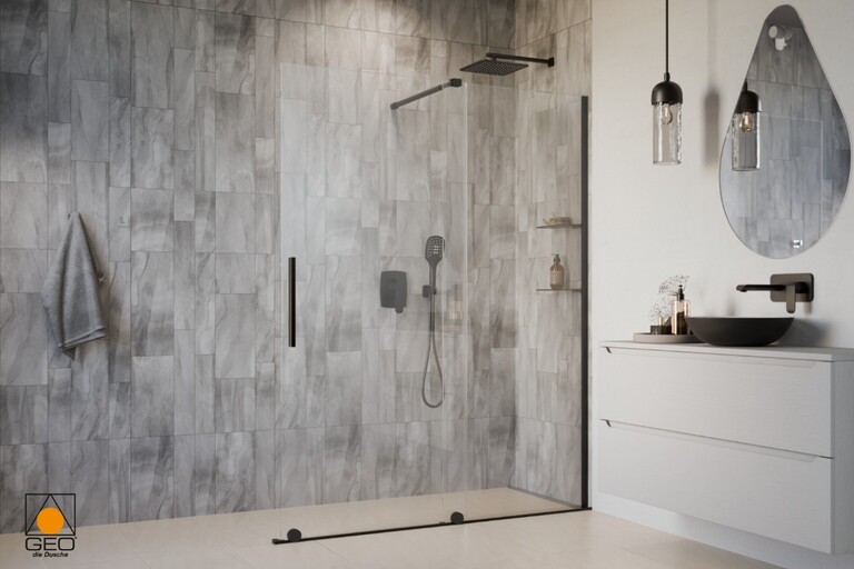 Das klare Sicherheitsglas und die dezenten Profile in Schwarz oder Silberglanz schaffen ein luftiges Raumgefühl. Diese Kombination ist ideal für moderne Badarchitektur mit begrenztem Platzangebot.