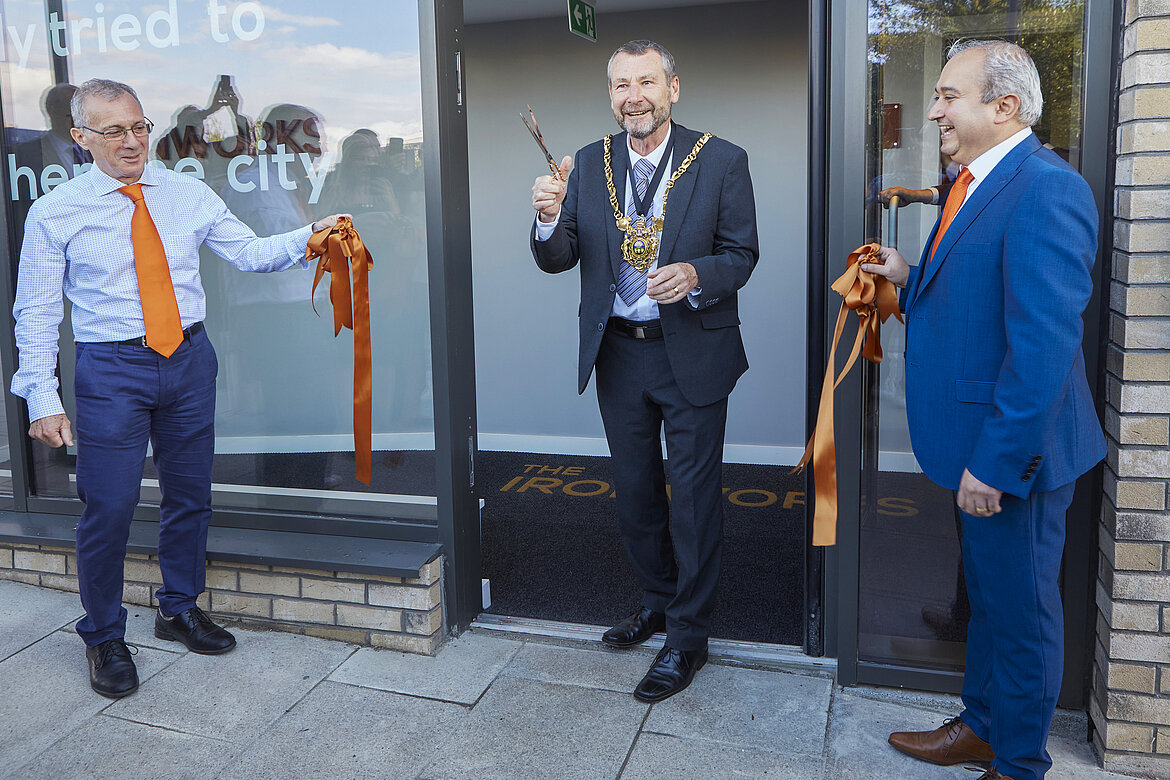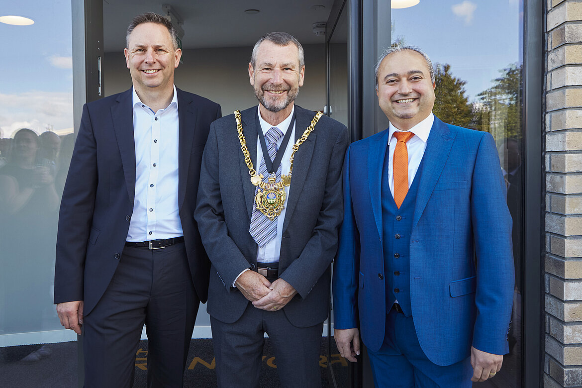Bei der Eröffnung des Wohnbaukomplex Ironworks betonte der Sheffielder Oberbürgermeister Colin Ross die Bedeutung des Projekts für die Gestaltung einer grüneren Zukunft der Stadt. Rechts im Bild (v.l.n.r.): Ralph Seewald, Managing Director Taconova Group AG, Oberbürgermeister Colin Ross und Behfar Abedinia, Taconova UK General Manager. Bilder: Taconova