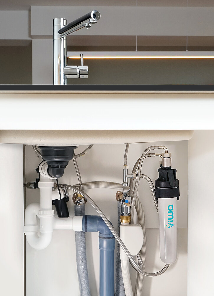 viwa wird einfach unter der Küchenzeile angeschlossen und verwandelt die Küchenarmatur in eine Zapfstelle für hochwertiges Trinkwasser. Für erhöhten Bedienkomfort verfügt der Filter über eine spezielle Connector-Technologie, die den regelmäßigen Tausch der Filterkartusche erheblich erleichtert. Bildmaterial: perma-trade Wassertechnik