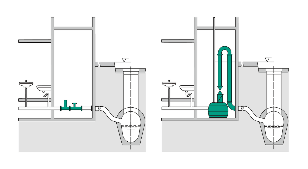 Hebeanlagen (rechts im Bild) hingegen bieten den höchstmöglichen Grad an Sicherheit und Komfort. Sie kommen zudem ins Spiel, wenn die Voraussetzungen für Rückstauverschlüsse nicht erfüllt sind. Gleichzeitig gibt es keine Gefahr von Rückstau in das Gebäude durch verstopfte oder undichte Rückstauklappen. Hebeanlagen verfügen nach DIN EN 12056-4 über eine Rückstauschleife, also einen Leitungsbogen der höher als die Rückstauebene ausgeführt wird. So ist es aus physikalischer Sicht unmöglich, dass Abwasser aus dem öffentlichen Kanal zurück in das Gebäude gedrückt wird.
