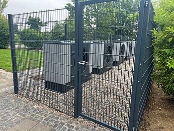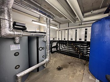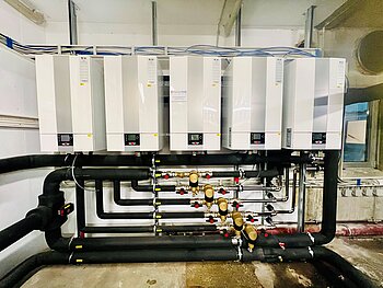 Eine Wärmepumpenkaskade aus fünf parallel geschalteten Wärmepumpen WOLF CHA-16/20 wird monoenergetisch bivalent betrieben und erzeugt aus PV-Strom und der Wärme der Umgebungsluft Warm- bzw. Kaltwasser für die Lüftungsanlagen sowie für die Heizkreisläufe. Es wird in 1.600 Liter fassenden Warmwasserspeichern und einem 1.000 Liter-Kaltwasser-Speicher gepuffert. Die Wärmepumpen haben inklusive Peripherie eine Heizleistung von 75 kW (bei -13 °) und eine Kühlleistung von 50 kW.