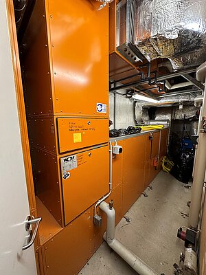 Die Lüftungsanlagen auszutauschen hätte das der Betreiberfamilie zur Verfügung stehende Budget deutlich überschritten. Stattdessen wurden die Ventilatormotoren der Bestandsgeräte ertüchtigt, so dass sie statt nur zweistufig heute stufenlos über CO2-Sensoren in den zu klimatisierenden Räumen regelbar sind. Sie haben jeweils eine Luftleistung zwischen 1.800 und 5.000 m3/h.