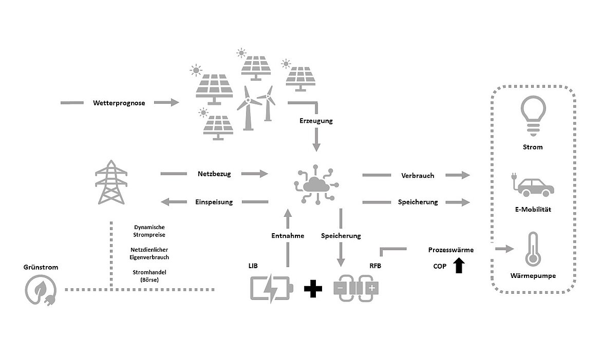 Um dieses komplexe Energiesystem effizient und effektiv managen zu können, wird ein KI-gestütztes Energiemanagementsystem eingeführt. Dieses optimiert auf der Basis von Wetterprognosen und betrieblichen Anforderungen die multikriterielle Balance von Erzeugung und Netzbezug, netzdienlichem Eigenverbrauch und Stromhandel an der Börse, Speicherung und Einspeisung/Verbrauch. Der Fokus liegt damit auf einem wöchentlichen Prozess mit intelligenter Sektorenkopplung statt auf einem täglichen voreingestellten Heizzyklus.