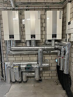 „Diese Wärmepumpen-Lösung hat inklusive Peripherie eine Anschlussleistung von nur 52 kW – also im Vergleich mit einer Großwärmepumpe nur etwa ein Drittel – und das bietet sowohl Vorteile bei der Investition als auch bei der Regelbarkeit. Die verhältnismäßig kleinen, parallel geschalteten Wärmepumpen machen die Nutzung von selbst erzeugtem PV-Strom erst möglich, insbesondere in Phasen, in denen nur geringere Leistungen durch die PV-Anlage zur Verfügung gestellt werden kann“, erläutert Tim Kohlhaas.