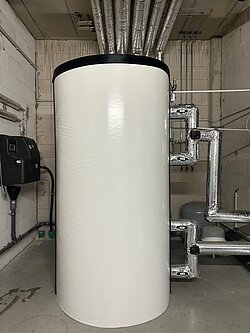 Alt- und Neubau werden durch zwei eigenständige Heizungskreisläufe versorgt, in die jeweils ein 1,5 m³ fassender Schichtenspeicher integriert ist.