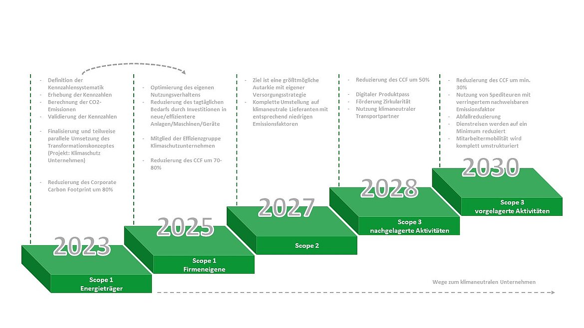 Neben den bisher erreichten Zielen sollen 2025 weitere 70 bis 80 % des Corporate Carbon Footprint (CCF) eingespart werden, indem in effiziente Anlagen, Maschinen und Geräte investiert wird. Mit den bis 2027 vorgesehenen Maßnahmen kann in den Scopes 1 und 2 des Greenhouse Gas Protocol (GHG Protocol) Klimaneutralität bilanziert werden. Darüber hinaus sind nach 2027 auch Maßnahmen gemäß Scope 3 geplant, um den CCF im Unternehmen sowie in der Wertschöpfungskette weiter zu senken. Dazu zählen zum Beispiel die Förderung der Zirkularität, Nutzen von möglichst klimaneutralen Transporten, Einführung von digitalen Produktpässen, die Vermeidung von Abfall und die Förderung einer nachhaltigen Mitarbeitermobilität.