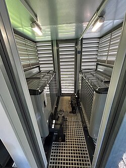 Als Wärmequelle für den Bestandsbau (WOLF ProjectCube 30 = 3 x CHA 10 (Siehe Kastentext) dient nicht nur die Außenluft, sondern auch die Wärme aus der Abluft des Messlabors und der Stromspeicher. Die zweite Kaskade für den Neubau (2 x CHA 10 mit vandalensicherer Schutzeinhausung) nutzt dagegen zusätzlich die Abwärme der Kompressoren und der Stromspeicher als zusätzliche Energiequelle. Diese (sonst verlorene) Wärmeenergie wird jeweils zur Rücklaufanhebung genutzt.