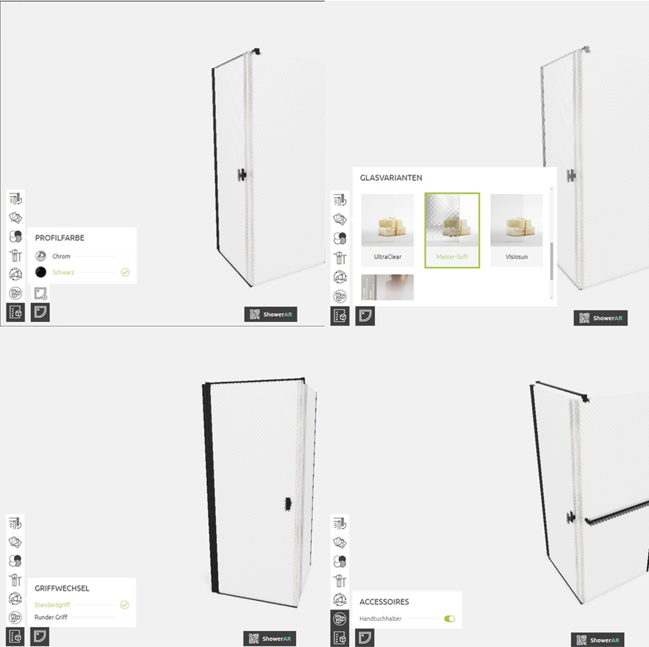 Am Ende können Sie die Duschkabine in einer Badezimmer-Umgebung von allen Seiten anschauen und Modelldetails genauer betrachten, damit sie sich die Kunden Ihre Duschkabine noch besser vorstellen können.