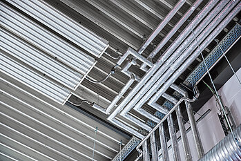 Die Energieversorgung der Hallen läuft witterungsgeführt. Die Vorlauftemperatur beträgt bis zu 85 °C, mit einer Spreizung von etwa 15 bis 20 Kelvin zum Rücklauf. Gesteuert wird zentral, wobei die Heizperiode etwa im Oktober beginnt und bis ins Frühjahr reicht. Die Zieltemperatur in den Hallen liegt konstant zwischen 14 und 18 °C – ausreichend für ein angenehmes Arbeitsumfeld und gleichzeitig förderlich für stabile Prozessbedingungen im Stahlbau.