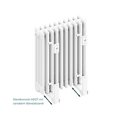 Für den Röhrenradiator Zehnder Charleston steht jetzt die HDCF-Konsole (Heavy Duty Console Flexible) zur Verfügung. Sie basiert auf der bewährten HDC-Bauweise, ermöglicht jedoch zusätzlich einen variablen Wandabstand im Bereich von 30 bis 105 Millimeter – ideal für Altbausanierungen mit Innendämmung oder beim Austausch alter Heizkörper. Abhängig von der Bautiefe des Heizkörpers und des gewünschten Wandabstand-Bereichs stehen insgesamt 25 verschiedene Konsolentypen zur Verfügung. Die unterschiedlichen Einzelteile wie Auflageplatten sind bei den jeweiligen Konsolentypen vormontiert und beschleunigen die Montage vor Ort. Die HDCF-Lösung ist konform mit der geltenden Richtlinie VDI 6036, Anforderungsklasse 3. Sie wird verzinkt und lackiert ausgeliefert, ist in der Standardfarbe RAL 9016, optional aber auch in Sonderfarbe, passend zum Heizkörper bestellbar.